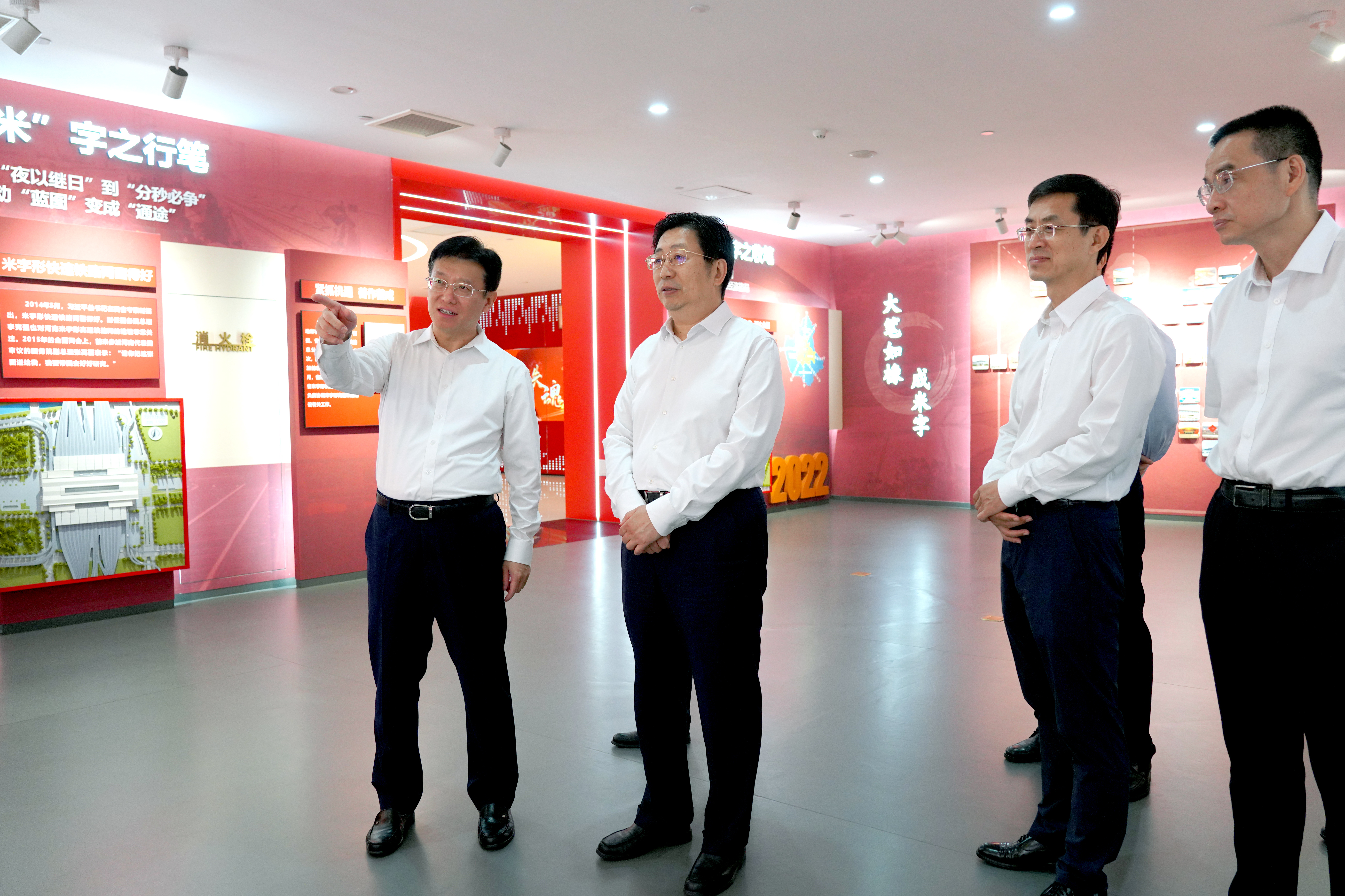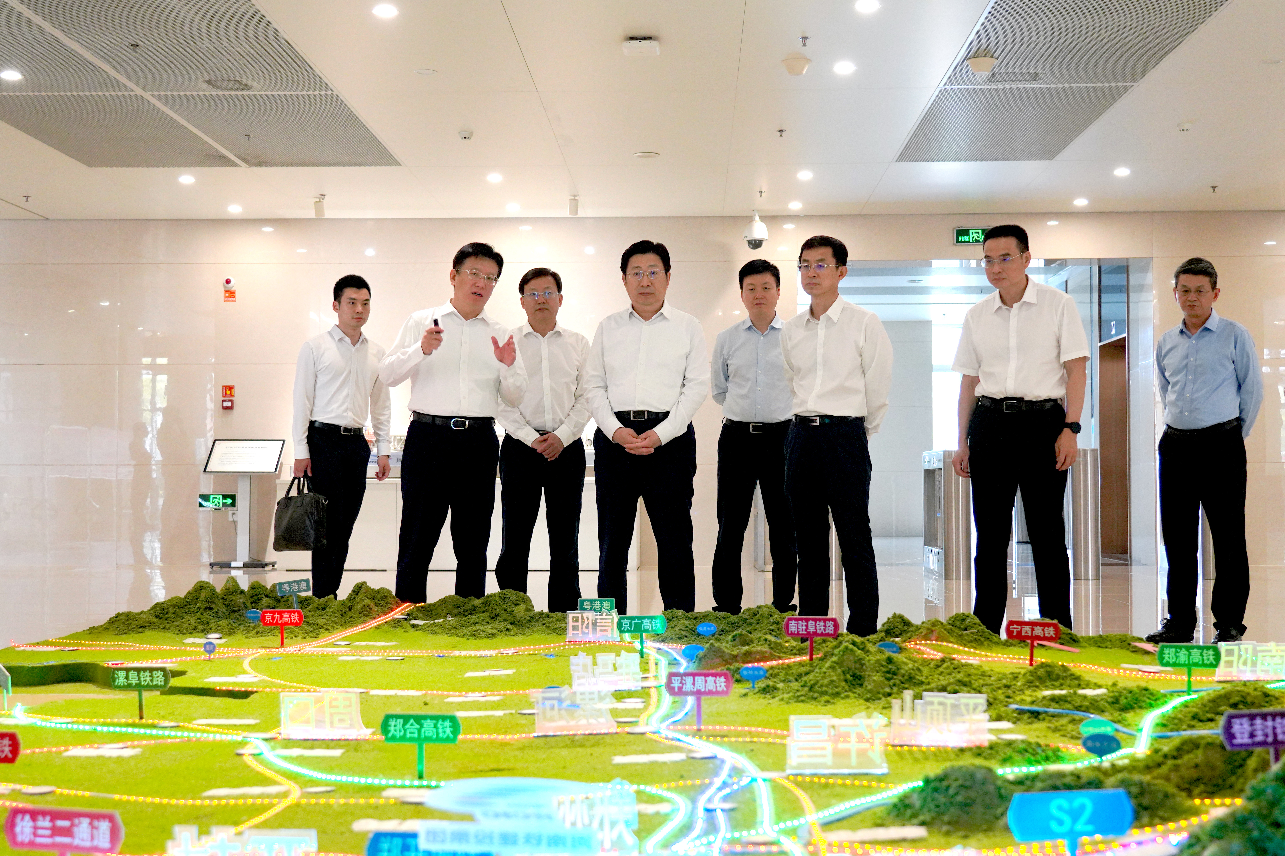 調(diào)研期間,譚炯一行實(shí)地考察了河南鐵路網(wǎng)沙盤,參觀了河南鐵路展覽館。系統(tǒng)了解了河南在全國率先建成米字形高鐵網(wǎng)的建設(shè)歷程,及其從戰(zhàn)略、經(jīng)濟(jì)、社會、區(qū)位、區(qū)域、開放、生態(tài)等多維度賦能河南高質(zhì)量發(fā)展的顯著成效,并深入了解雄商高鐵河南段、平漯周高鐵、焦洛平高鐵、南信合高鐵等重點(diǎn)項(xiàng)目推進(jìn)情況。