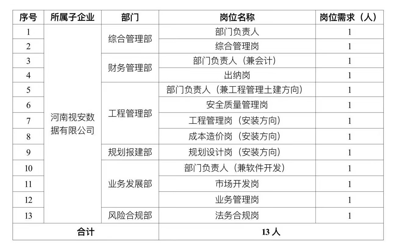 根據(jù)河南鐵建投物流有限公司工作計劃,為滿足河南視安數(shù)據(jù)有限公司項目建設(shè)運營人才需求,確保數(shù)字物流綜合服務(wù)多式聯(lián)運智慧樞紐項目建設(shè)、倉儲、信息化服務(wù)等高鐵物流業(yè)務(wù)順利實施?,F(xiàn)面向社會公開招聘13人,有關(guān)事宜公告如下: